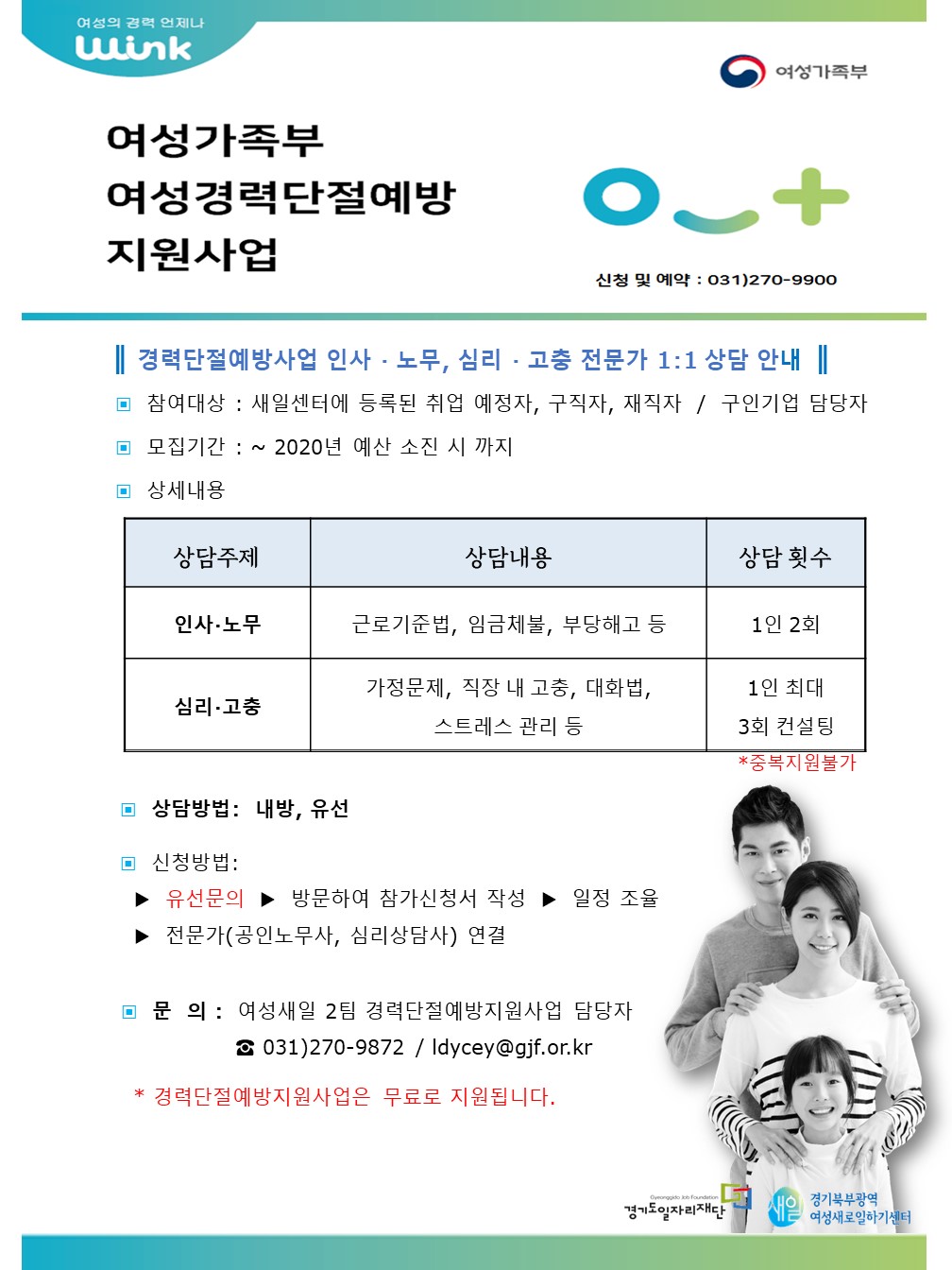 | 제목 | 2020년 경력단절예방사업 [인사, 노무, 심리고충 1:1 전문가 상담 신청안내] |